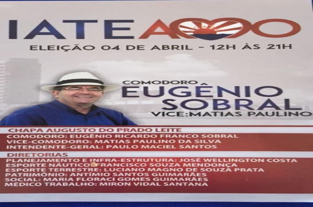 diversas atividades propiciadas nos últimos anos. Com o slogam “IateAmo” a chapa (ver print ao lado) encabeçada por Eugênio Sobral reúne pessoas com história e abnegação ao clube que é considerado o da família sergipana. Matias Paulino é o vice-comodoro. A eleição acontecerá dia 4 de abril, das 12h às 21h.