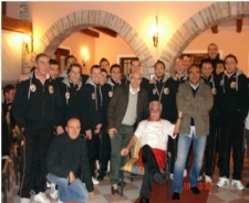 Restarante da Dino continua recebendo as celebridades do mundo esportivo, do cinema e da política. Na foto, Moreno Sartorato, presidente do Calcio Rovere, time regional do nordeste da Itália é recebido pelo chefe e proprietário Dino Caramel.