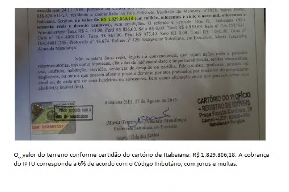 Valmir não é perdulário – A isenção que Luciano pede para o aliado é uma afronta a administração pública, já que o terreno foi vendido e não doado, como alguns aliados dele chegaram a afirmar. O valor da venda: R$ 1.829.860,18. Claro que um gestor sério não pode isentar IPTU quando se trata de venda por conta de ser penalizado por renúncia de receita. O que está sendo cobrado é o valor normal, de 6%, conforme o Código Tributário de Itabaiana, com juros e multas.