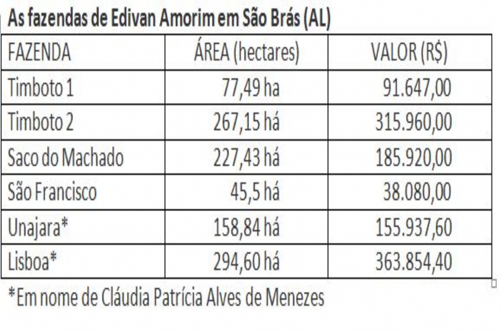 Consta que Edivan é proprietário de seis fazendas no município de São Brás. Ou foi proprietário, já que todas as terras