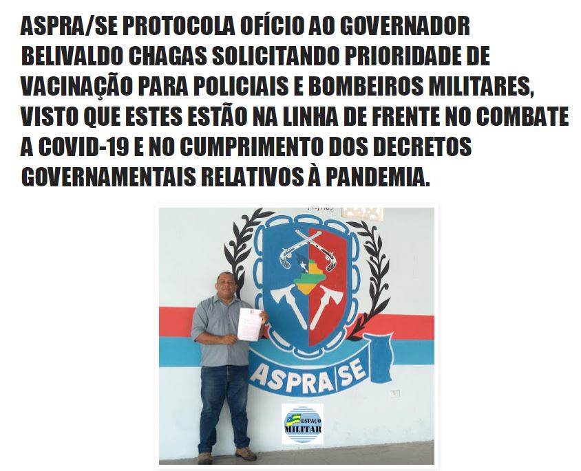 Na manhã da terça-feira, dia 02, a ASPRA/SE (Associação dos Praças Policiais e Bombeiros Militares do Estado de Sergipe), através do seu diretor Sargento Alex Lima, protocolou ofício ao governador Belivaldo Chagas, solicitando prioridade de vacinação para policiais e bombeiros militares que estão na linha de frente no combate a covid-19 e no cumprimento dos decretos governamentais relativos à pandemia.