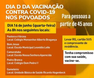 Municipal de Saúde, antecipou o calendário de vacinação e iniciou na última segunda-feira, 14, a imunização contra a COVID-19 em pessoas a partir de 45 anos sem comorbidades. Os índices no município histórico superam os números registrados em Sergipe e em algumas cidades brasileiras. Para evitar aglomerações, permitir mais comodidade à população e acelerar a imunização, a Prefeitura irá realizar hoje, 16, o Dia “D” de Vacinação contra a Covid-19, nos bairros e povoados. O início da vacinação será sempre às 8h. É importante a população levar RG, CPF, cartão SUS e comprovante de residência.