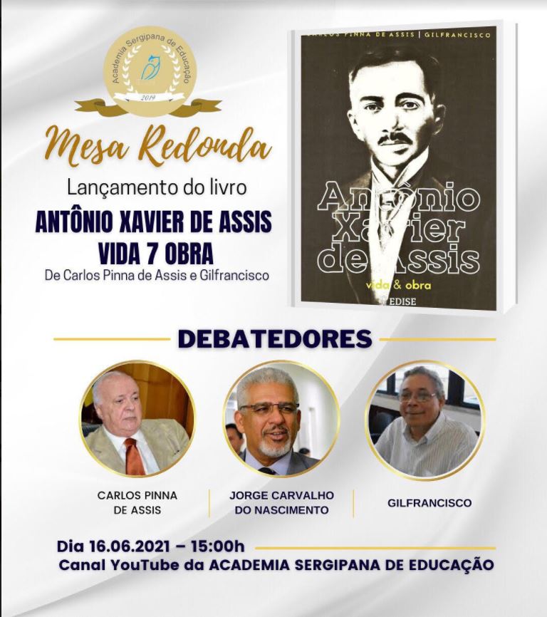 Hoje, 16, a partir das 19h, lançamento do livro: Antônio Xavier de Assis, Vida e Obra A Academia Sergipana de Educação realiza hoje, 16, às 19h, uma Mesa Redonda para lançar o livro “Antônio Xavier de Assis, Vida e Obra”., de autoria de Carlos Pinna de Assis e Gilfrancisco. A Mesa Redonda terá como debatedores Carlos Pinna de Assis, conselheiro do TCE/SE e filho do homenageado no livro; Jorge Carvalho do Nascimento e Gilfrancisco, jornalista e um dos pesquisadores mais atuantes em Sergipe na atualidade. Aqui, no canal da Academia Sergipana de Educação: https://www.youtube.com/watch?v=PAgFrIRqIEQ