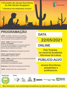 Academia no YouTube (https://www.youtube.com/c/academiagloriensedeletras/featured) , estará realizando o V Encontro de Jovens Escritores do Alto Sertão Sergipano (V EJEASS), cujo tema será “Literatura em Ambientes Virtuais”. O evento tem como objetivo promover um espaço de interação entre os jovens escritores e os mais experientes com o intuito de trocarem saberes, aproximando o universo cultural e literário da sociedade e também das instituições que promovem tais ações. Sua primeira edição foi em 2017. Nesta edição, haverá duas mesas-redondas, conforme seguinte programação: