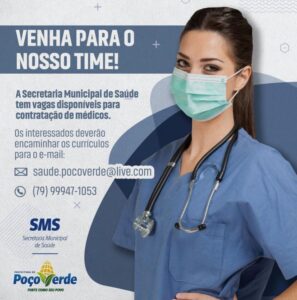 Poço Verde: Prefeitura está contratando médicos E pelas redes sociais ontem, 19, a Prefeitura de Poço Verde anunciou que tem vagas para contratação de médicos. Os interessados podem enviar os currículos para o e-mail: pocoverde@live.com ou ligar para 79 – 99947-1053. “Vivemos um momento delicado da pandemia, onde as pessoas que adquirem o vírus estão evoluindo o quadro de forma rápida, os casos graves vem aumentando mais uma vez no Brasil. De fato, a demanda aumentou para os médicos. Muitos se encontram com vários postos de trabalho e o cansaço, às vezes, os fazem optar por ficar na capital. Dessa forma, estamos contratando médicos com condições salariais excelentes! Venha para o nosso time e nos ajude nesse momento tão difícil!”, explicou o prefeito Iggor Oliveira nas redes sociais.