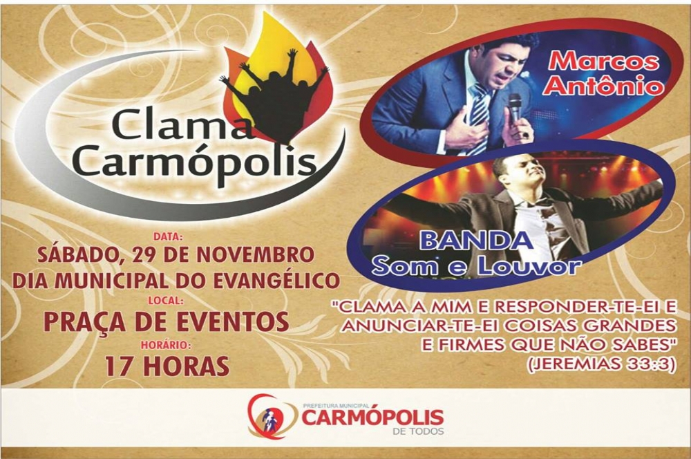 evangélico. Este ano, o cantor e ícone da música gospel Marco Antônio e a banda Som e Louvor, vêm a Sergipe abrilhantar a noite dos carmopolitanos. A palavra de Deus será ministrada pelo pastor Moisés Queiroz da cidade de Malhador. O evento será realizado na Praça de Eventos, às 17h, e é organizado pelas Igrejas Evangélicas do município com apoio da prefeitura.
