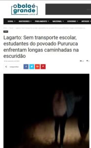 Lagarto: Sem transporte escolar, estudantes do povoado Pururuca enfrentam longas caminhadas na escuridão Deu no site “O Bolo é Grande: Os estudantes do povoado Pururuca, no município de Lagarto, enfrentam longas caminhadas por uma estrada barrenta e sem iluminação para poderem frequentar a escola. Segundo informações, o transporte escolar foi suspenso na região devido às péssimas condições das estradas no povoado.