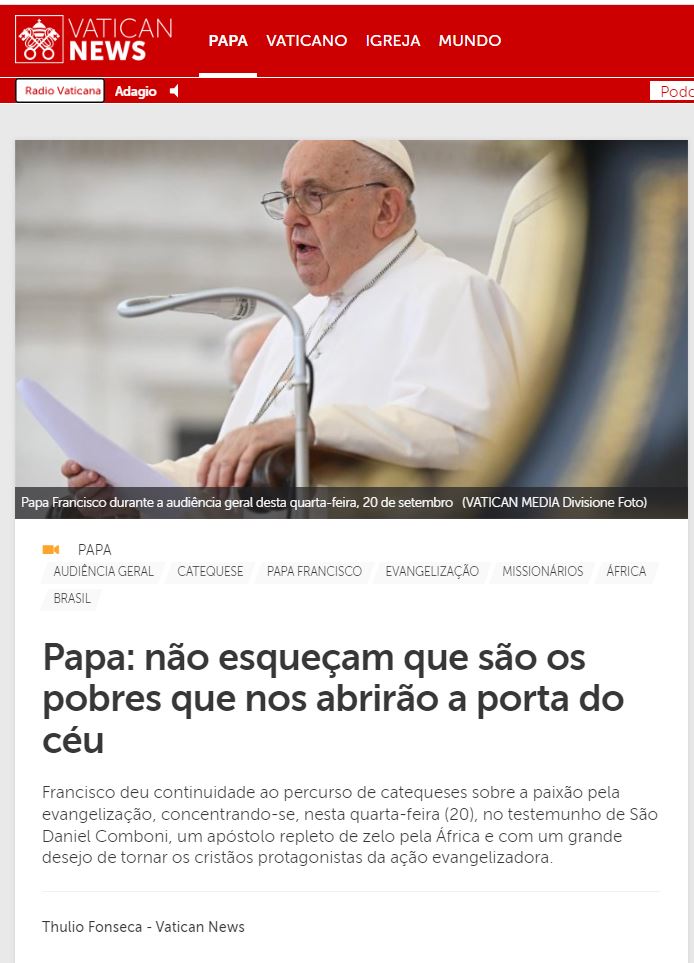 Ouça com a voz do Papa compartilhe: https://www.vaticannews.va/pt/papa/news/2023-09/papa-audiencia-geral-sao-daniel-comboni-20-setembro-2023.html