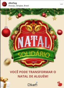 Quando o Natal se aproxima, o espírito solidário costuma se revigorar. A data sensibiliza as pessoas criando um cenário que deveria existir durante o ano inteiro. Para aqueles que querem deixar os festejos natalinos mais felizes para outros, A CAMPANHA NATAL SOLIDÁRIO DÍKEFI, é um projeto desenvolvido pela Administração Díkefi, é uma das alternativas de se angariar apoio de várias pessoas para a ação. A ideia da campanha é promover um pouco mais de assistência aos menos favorecidos, através da arrecadação de donativos (alimentos, brinquedos, vestuários, calçados, utensílios domésticos e móveis).