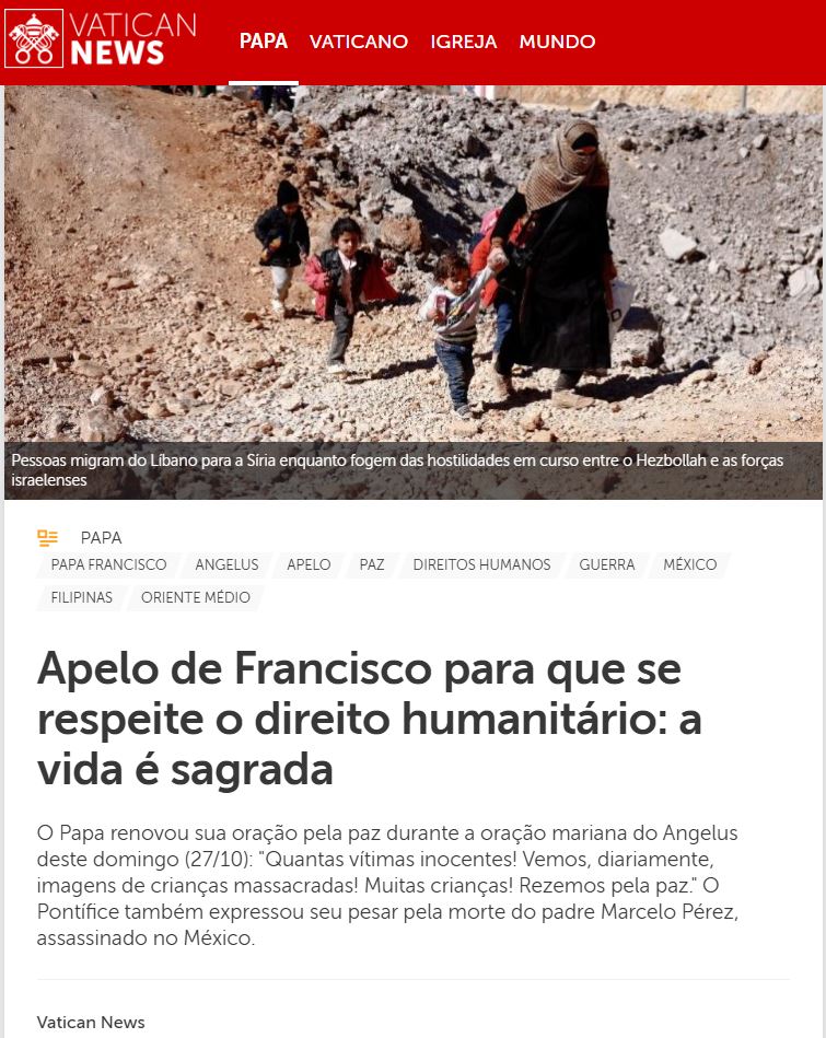 O Papa Francisco, em seus apelos, após a oração mariana do Angelus deste domingo (27/10), insistiu no compromisso internacional para que sejam dados passos concretos pela paz, especialmente onde as consequências da guerra afetam menores, civis e lugares de culto. “A vida é sagrada”, repetiu incansavelmente o Sucessor de Pedro. Aqui: