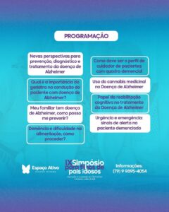 Promoção O evento promovido pelo Espaço Ativo, vai contar com uma equipe de geriatria e gerontologia com expertise no diagnóstico e tratamento da doença de Alzheimer, onde fará uma abordagem com esclarecimentos e orientações sobre tudo que está em torno do problema, ensinando o melhor cuidado, além de contribuir para a prevenção da doença.