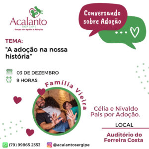 Imperdível! Amanhã, 03, a partir das 9h, no auditório do Ferreira Costa em Aracaju: “A adoção na nossa história”. Cada evento tem o objetivo de divulgar e orientar a população sobre a adoção, com especialistas e profissionais e desmistificando o preconceito que ainda existe com relação a adoção. Neste evento, o casal Célia e Nivaldo, pais por adoção, farão um relato de como a adoção transforma uma família! Vem com a gente conhecer essa experiência! Num projeto do Acalanto Sergipe, Grupo de Apoio à Adoção. Mais informações: https://www.instagram.com/acalantosergipe/ ou (79) 99865 2353.