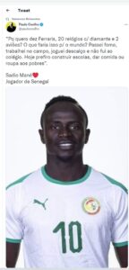 “Pq quero dez Ferraris, 20 relógios c/ diamante e 2 aviões? O que faria isso p/ o mundo? Passei fome, trabalhei no campo, joguei descalço e não fui ao colégio. Hoje prefiro construir escolas, dar comida ou roupa aos pobres”. Sadio Mané❤️ Jogador de Senegal