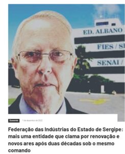 SE: Federação das Indústrias (FIES) mais uma entidade empresarial que necessita e clama por renovação após 2 décadas sob o mesmo comando Deu no Andersons Blog: que no próximo dia 5 de maio de 23, precisamente, o atual presidente da FIES, Eduardo Prado, completa 20 anos no cargo representativo mais importante do setor industrial sergipano, à frente de uma instituição que tem braços importantíssimos como o SESI e o SENAI, que podem e devem ser decisivos para o avanço da indústria local. Mas o que se tem visto é justamente a estagnação! Afinal, quando não há renovação, tudo fica no mesmo lugar e a realidade do setor industrial sergipano é a prova viva de que o segmento parou no tempo. Mas e de onde viria tanto poder para um homem só, durante tanto tempo? Todo artigo aqui.