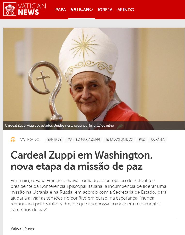 A Santa Sé, por meio de um comunicado divulgado pela Sala de Imprensa vaticana, informa que de 17 a 19 de julho de 2023, o cardeal Matteo Maria Zuppi, arcebispo de Bolonha e presidente da Conferência Episcopal Italiana, acompanhado de um oficial da Secretaria de Estado, viajará a Washington como enviado do Santo Padre Francisco. Ouça e compartilhe: