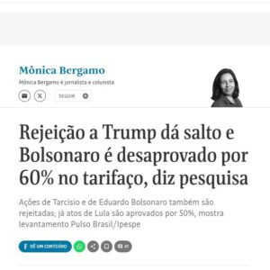 A rejeição a Donald Trump, Jair Bolsonaro e Tarcísio de Freitas deu um salto significativo, segundo pesquisa divulgada na última quarta-feira pela jornalista Mônica Bergamo. O dado, embora alarmante para os entusiastas da extrema-direita, é, na verdade, um alívio para os que ainda acreditam na democracia como valor e projeto de país — não como trampolim familiar para aventuras autoritárias.