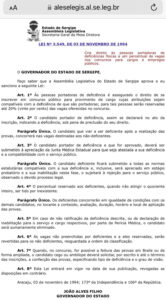 Concurso da PMSE e o sarapatel de coruja. Contas deficientes têm que respeitar lei estadual de 20% e não 5% como pediu o MPSE Conforme o print acima a lei estadual de 1994 garante cota de 20% para os deficientes em concursos públicos. O MPSE, recentemente, pediu para a PMSE conceder 5% das vagas. A questão do direito da inclusão dos deficientes é clara na lei estadual. Ou seja, vai parar na Justiça e o concurso terá que respeitar a lei. Não seria melhor adequar a legislação do que esperar a judicialização? Um verdadeiro sarapatel de coruja, como diz o grande radialista Antônio Oliveira.