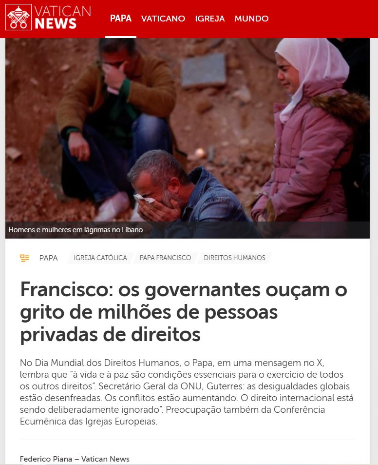 Os #DireitosHumanos à vida e à paz são condições essenciais para o exercício de todos os outros direitos. Que os governantes ouçam o grito de paz de milhões de pessoas privadas dos direitos mais básicos por causa da guerra, a mãe de todas as pobrezas!” O Papa Francisco lança seu forte apelo, e o de toda a Igreja, com uma mensagem no X por ocasião do Dia Mundial dos Direitos Humanos, celebrado nesta terça-feira (10/12). Aqui: https://www.vaticannews.va/pt/papa/news/2024-12/francisco-governantes-oucam-grito-milhoes-pessoa.html
