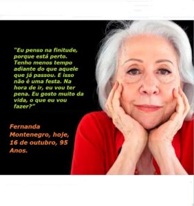 “Eu penso na finitude, porque está perto. Tenho menos tempo adiante do que aquele que já passou. E isso não é uma festa. Na hora de ir, eu vou ter pena. Eu gosto muito da vida, o que eu vou fazer?” Fernanda Montenegro, hoje, 16 de outubro, 95 Anos.
