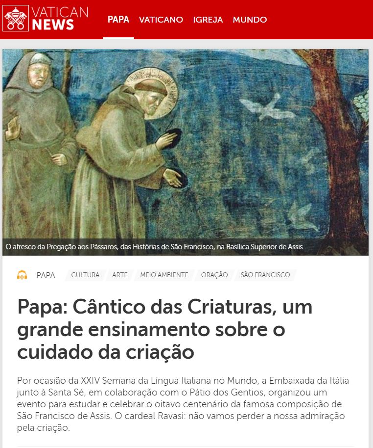 É necessário continuar “o trabalho de conscientização no cuidado da criação”, “há um grande ensinamento naquela oração que há oito séculos nunca deixou de bater e que São Francisco compôs no final de sua vida”. Foi assim que o Papa Francisco, através da mensagem enviada pelo secretário de Estado, cardeal Pietro Parolin, expressou encorajamento pela iniciativa que aconteceu na manhã desta terça-feira (15/10) na sede da Embaixada da Itália junto à Santa Sé, 800 anos após a redação do Cântico das Criaturas por São Francisco. Aqui: https://www.vaticannews.va/pt/papa/news/2024-10/cantico-das-criaturas-francisco-semana-lingua-italiana-no-mundo.html