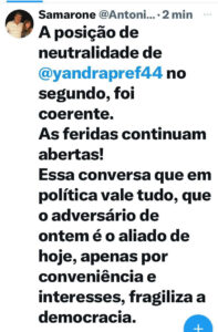É preciso restabelecer valores ético e moral. Confundir a malandragem e a antipolítica com democracia é alienação e ignorância total. É preciso voltar a trilhar a normalidade da disputa eleitoral porque da forma que se encontra corre o risco de enveredar de uma vez num caminho altamente perigoso para a democracia.