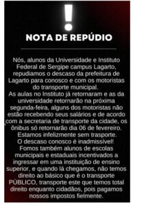 Em Lagarto, estudantes do IFS estão sem transporte Deu no site “O Bolo é Grande”: “Na quinta-feira, 12, os estudantes do Instituto Federal de Sergipe, Campus Lagarto, afirmaram que desde o início do ano letivo estão sem transporte escolar. Uma nota de repúdio foi lançada, afirmando ainda que os motoristas estão sem receber o salário. “Nós, alunos da Universidade e Instituto Federal de Sergipe, Campus lagarto, repudiamos o descaso da prefeitura de Lagarto para conosco e com os motoristas do transporte municipal. As aulas no Instituto já retornaram e as da Universidade retornarão na próxima segunda-feira. Alguns dos motoristas não estão recebendo seu salário e de acordo com a secretaria de Transporte da Cidade, os ônibus só retornarão dia 6 de fevereiro. Estamos, infelizmente, sem transporte. O descaso conosco é inadmissível! Fomos também alunos de escolas municipais e estaduais incentivados a ingressar em uma instituição de ensino superior, e quando lá chegamos não temos direito ao básico que é o transporte público, transporte este que temos total direito enquanto cidadãos, pois pagamos nossos impostos fielmente”.Após a repercussão, a prefeitura de Lagarto ainda não se pronunciou sobre mais um descaso com o transporte escolar no município.”