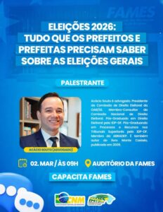 FAMES abre calendário 2026 com capacitação sobre eleições gerais A Federação dos Municípios do Estado de Sergipe (FAMES), por meio da Escola de Gestão Governador João Alves, realiza no próximo dia 2 de março, o 1º Capacita FAMES de 2026, com o tema “Eleições 2026: Tudo que os prefeitos e prefeitas precisam saber sobre as eleições gerais”. O evento abre o calendário anual de forma estratégica, abordando um assunto essencial para as gestões municipais em ano de eleições gerais. A programação acontece a partir das 9h, no auditório da entidade, e é voltada a prefeitos, prefeitas, secretários e servidores municipais.