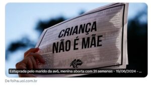 Estuprada pelo marido da avó, menina de 14 anos de SP viaja até a BA para interromper gestação de 31 semanas. Mãe e filha procuraram dois hospitais da capital paulista, mas não conseguiram ter acesso ao aborto legal. Aqui matéria.