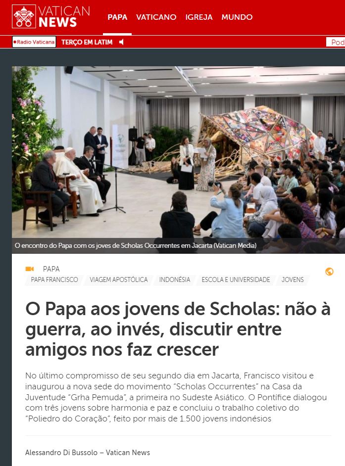 “Fazer guerra entre nós é sempre uma derrota, mas discutir nos faz crescer”. Esse é o coração da mensagem do Papa aos jovens no último compromisso de seu segundo dia em Jacarta, uma visita à Casa da Juventude ‘Grha Pemuda’, a nova e primeira sede do movimento ‘Scholas Occurrentes’ no Sudeste Asiático. Sua visita é uma celebração da educação inclusiva, que ensina que “as diferenças não são uma coisa ruim, mas uma beleza única”, como Christine, uma jovem que já sofreu bullying, conta ao Papa em seu testemunho. Festa de Francisco dialogando com os jovens sobre harmonia e diálogo. Festa da educação “artesanal” do movimento lançado em 2013 pelo próprio Papa Francisco, com metodologias inovadoras que incorporam tecnologia, esporte e artes. “Fazer guerra entre nós é sempre uma derrota, mas discutir nos faz crescer”. Esse é o coração da mensagem do Papa aos jovens no último compromisso de seu segundo dia em Jacarta, uma visita à Casa da Juventude ‘Grha Pemuda’, a nova e primeira sede do movimento ‘Scholas Occurrentes’ no Sudeste Asiático. Sua visita é uma celebração da educação inclusiva, que ensina que “as diferenças não são uma coisa ruim, mas uma beleza única”, como Christine, uma jovem que já sofreu bullying, conta ao Papa em seu testemunho. Festa de Francisco dialogando com os jovens sobre harmonia e diálogo. Festa da educação “artesanal” do movimento lançado em 2013 pelo próprio Papa Francisco, com metodologias inovadoras que incorporam tecnologia, esporte e artes. Aqui: