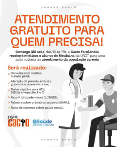 Domingo, 08, das 13h às 17h, Mutirão de atendimentos acontecerá no Bairro Farolândia, na Cacto Centro de Treinamento. Atendimentos médicos e diversos outros serviços especializados para a população. Tudo será realizado gratuitamente para toda a população presente.