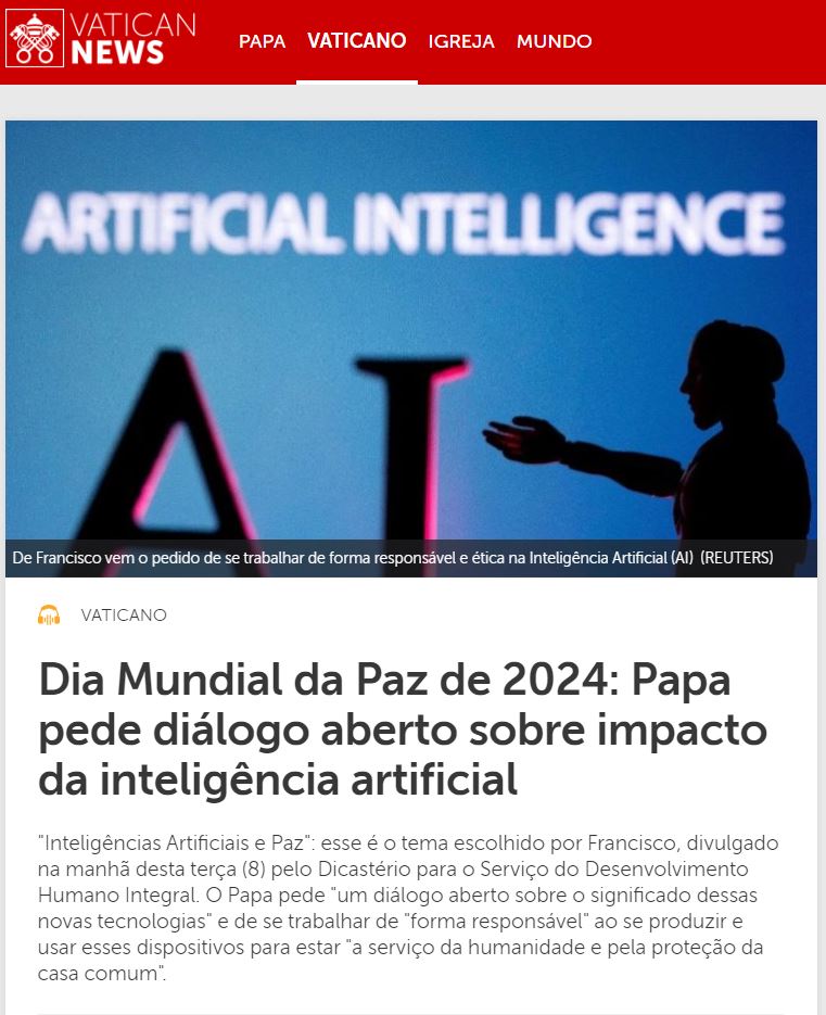 Ouça a reportagem e compartilhe: https://www.vaticannews.va/pt/vaticano/news/2023-08/tema-dia-mundial-da-paz-2024-inteligencia-artificial.html