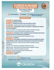 Hospital de Cirurgia promove III Simpósio da Qualidade e Segurança do Paciente hoje, 17 Com o tema “Governança Clínica: o Pilar Fundamental do Cuidado Eficiente”, o Hospital de Cirurgia (HC) promove hoje, 17, III Simpósio da Qualidade e Segurança do Paciente. Voltado para equipe multidisciplinar e convidados especiais da instituição hospitalar, o evento acontecerá no auditório do Museu da Gente Sergipana, a partir das 13h45.