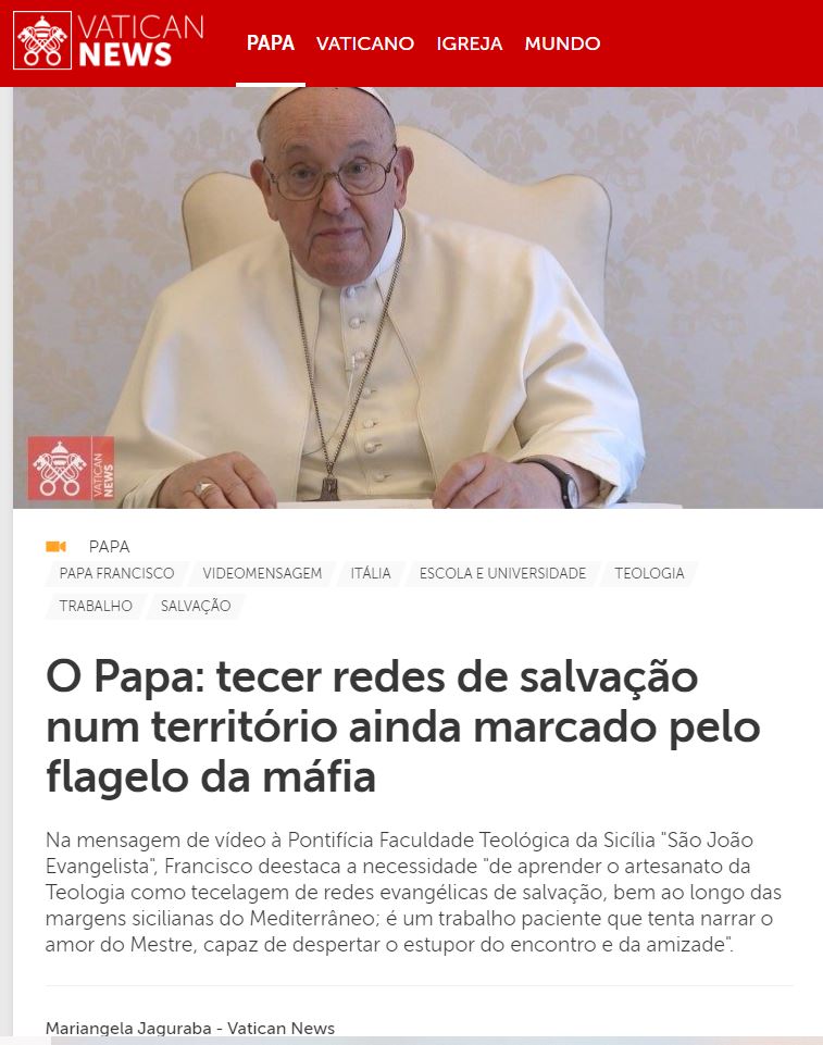 O Papa Francisco enviou uma mensagem de vídeo, nesta quarta-feira (16/10), à Pontifícia Faculdade Teológica da Sicília “São João Evangelista” por ocasião do 43º aniversário do início das atividades acadêmicas. “Coloco-me idealmente nas pegadas de São João Paulo II, que visitou a Faculdade da Sicília em 21 de novembro de 1982, por ocasião de sua visita pastoral a Belice e Palermo”, diz o Papa na viodeomensagem. Aqui: https://www.vaticannews.va/pt/papa/news/2024-10/papa-francisco-faculdade-sicilia-redes-salvacao-amor-mafia.html