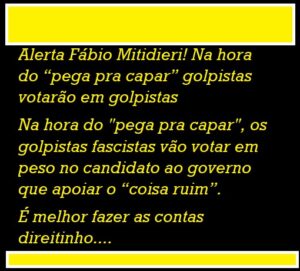 Na hora do “pega pra capar” , os golpistas fascistas vão votar em peso no candidato ao governo que apoiar o “coisa ruim”. Mais claro: ou seja, seja o candidato Valmir, Rodrigo, Eduardo Amorim ou qualquer outro. O governador vai sofrer se contar com o apoio de bolsonaristas como o capitão Samuel que passou este tempo todo no governo descascando o presidente Lula.