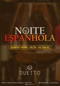 Que tal uma experiência Duetto em um clima espanhol? Nossa primeira Noite Espanhola será nesta quinta-feira, 26, com uma culinária recheada e vinhos especiais. A degustação será completa, com entrada, prato principal e sobremesa. As bebidas ficam à sua escolha, mas nós indicamos rótulos que irão harmonizar muito bem com nosso Menu. Tudo muito bem preparado e delicioso para lhe proporcionar uma experiência única. Reservas exclusivamente pelo WhatsApp: 99894-5718. Detalhes aqui: https://www.instagram.com/duetto_aracaju/