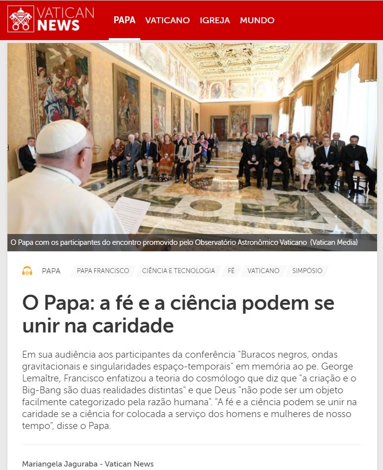 O Papa Francisco recebeu em audiência, nesta quinta-feira (20/06), na Sala dos Papas, no Vaticano, os participantes da II Conferência do Observatório Astronômico Vaticano (Specola Vaticana) em memória de Georges Lemaître intitulada “Buracos negros, ondas gravitacionais e singularidades espaço-temporais”. Em: https://www.vaticannews.va/pt/papa/news/2024-06/papa-francisco-specola-vaticana-georges-lemaitre-fe-ciencia.html