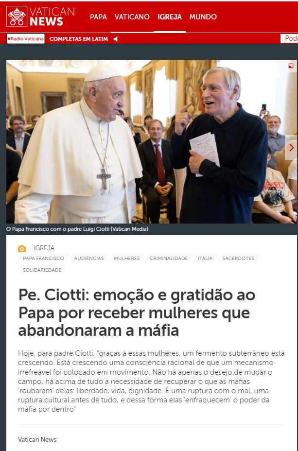 Ouça a reportagem e compartilhe: https://www.vaticannews.va/pt/igreja/news/2023-10/padre-ciotti-gratidao-papa-audiencia-mulheres-abandonaram-mafia.html