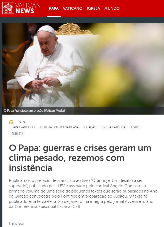 A oração é a respiração da fé, é sua expressão mais adequada. Como um grito silencioso que sai do coração daqueles que acreditam e se entregam a Deus. Não é fácil encontrar palavras para expressar esse mistério. Quantas definições de oração podemos encontrar nos santos e mestres da espiritualidade, bem como nas reflexões dos teólogos! No entanto, ela só pode ser descrita na simplicidade de quem a vive. O Senhor, por outro lado, advertiu-nos de que, quando oramos, não devemos desperdiçar palavras, iludindo-nos com a ideia de que seremos ouvidos. Ele nos ensinou a preferir o silêncio e a nos confiarmos ao Pai, que sabe do que precisamos antes mesmo de pedirmos a Ele (cf. Mt 6,7-8).