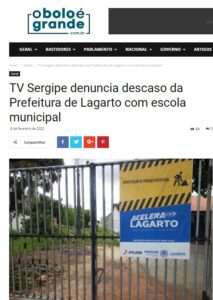 Deu no site “O Bolo é Grande”: A TV Sergipe, afiliada da Rede Globo, denunciou na quarta-feira, 8, o descaso da prefeitura de Lagarto, que está protelando a reforma da Escola Municipal Mateus José de Oliveira, no bairro Cidade Nova. Segundo imagens da TV Sergipe, praticamente não houve o início da reforma anunciada, já que nem o revestimento do local e nem as portas assentadas foram concluídas. Pais de alunos dizem que a promessa de entrega da reforma já tem seis meses. Na porta da unidade, o slogan “Acelera Lagarto”, porém, não há data de início e nem de finalização da reforma.