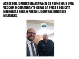 Do Blog Espaço Militar: Na quarta-feira, dia 08, por volta das 9 horas, o assessor jurídico da ASPRA/SE (Associação de Praças Policiais e Bombeiros Militares de Sergipe), Márlio Damasceno, se reuniu mais uma vez com o Comandante-Geral da PMSE, Coronel Alexsandro Ribeiro, onde solicitou melhorias para o PRESMIL (Presídio Militar) e outras unidades militares, que estão carecendo de condições dignas para os militares sergipanos.