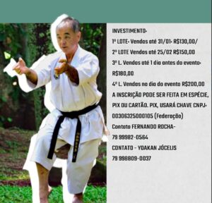 Seminário, dia 18 de Março, também no Colégio Master Já o seminário, terá a participação do mestre famoso no mundo da internet, Hélio Arakaki, um Sensei humilde e que tanto está atraindo seguidores pela sua forma tranquila de passar sua ideia de karatê. O sensei Arakaki está com sua agenda lotada e presenteou os caratecas sergipanos com sua participação em Aracaju. Com certeza, a comunidade carateca poderá desfrutar de um brilhante trabalho num seminário, com um mestre que é 6° Dan da CBK mora em Mato Grosso e foi aluno do grande Mestre Sagara um dos introdutores do karatê no Brasil. Hoje ele é aluno do Sensei Edson Nakama aluno mais velho do Mestre Sagara.