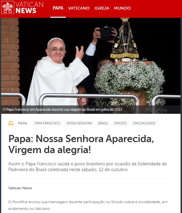 “No dia de Nossa Senhora Aparecida, quero saudá-los e estar perto de vocês. Sigam em frente, com essa mensagem da Virgem, que é toda a harmonia: harmonia entre todos os cristãos, harmonia com toda a humanidade e harmonia climática”, disse Francisco, utilizando uma das expressões mais significativas deste Sínodo, a harmonia, quem tem o Espírito Santo como protagonista. Ouça e compartilhe: