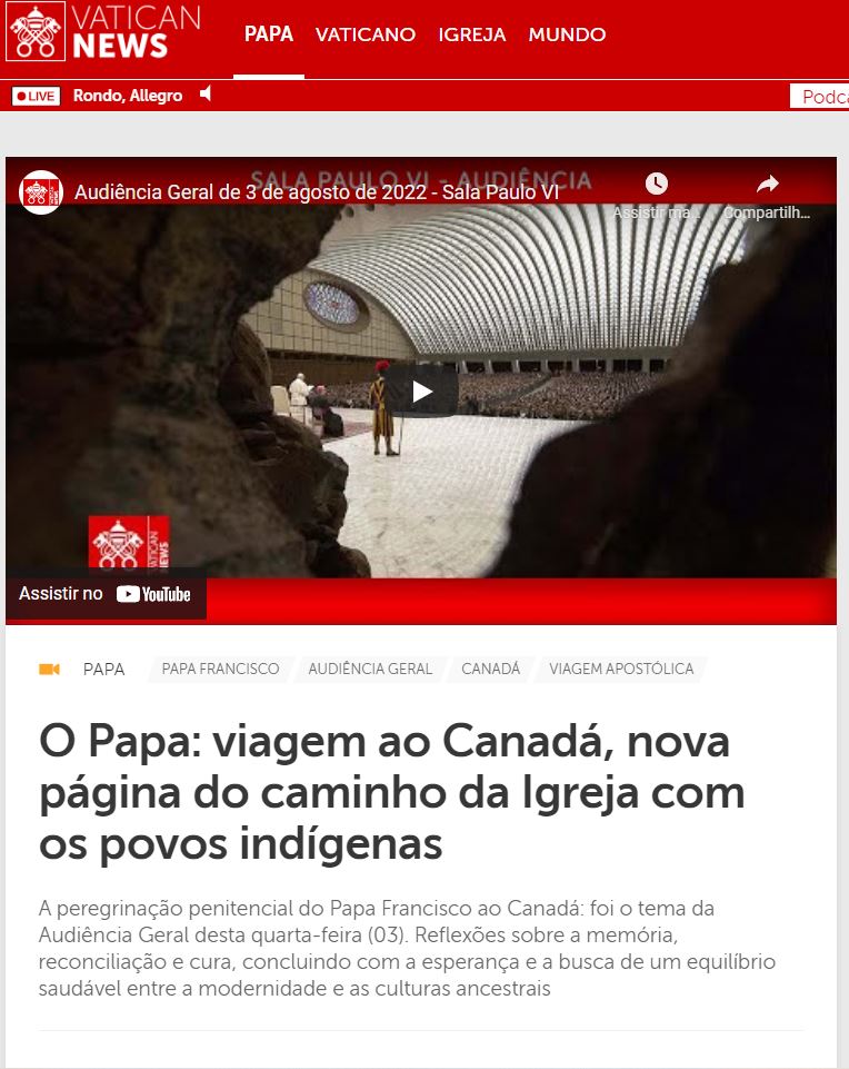 Na Audiência Geral desta quarta-feira (03), a primeira depois da pausa durante o mês de julho, o Papa Francisco entrou na Sala Paulo VI caminhando, sem a cadeira de rodas que o acompanhou nos últimos meses e partilhou com os presentes algumas reflexões sobre a recente viagem apostólica ao Canadá. Explicando a motivação disse: “Foi uma viagem diferente de qualquer outra. Com efeito, a principal motivação era encontrar os povos originais para lhes expressar a minha proximidade e tristeza, e pedir perdão pelo mal que lhes foi causado por aqueles cristãos, incluindo muitos católicos, que no passado colaboraram nas políticas de assimilação forçada e de resgate dos governos daquela época”. Ouça e compartilhe: https://www.vaticannews.va/pt/papa/news/2022-08/audiencia-geral-papa-francisco-viagem-canada-reflexoes.html