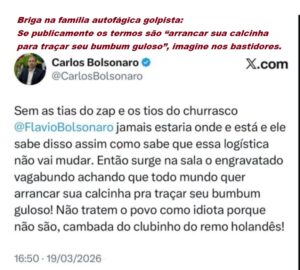 No último dia 19 de março, Carlos Bolsonaro – filho do golpista preso – publicou na rede social X, um texto que reflete bem o que é a família autofágica golpista miliciana sobre o irmão Flávio Bolsonaro: “Sem as tias do Zap e os tio do churrasco @FlávioBolsonaro jamais estaria onde está e ele sabe disso assim como sabe que essa logística não vai mudar. Então surge na sala o engravatado vagabundo achando que todo mundo quer arrancar sua calcinha para traçar seu bumbum guloso! Não tratem o povo como idiota porque não são, cambada do clubinho do remo holandês!”