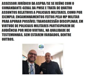 Assessor jurídico da ASPRA/SE se reúne com comandante-geral da PMSE Na quinta-feira, dia 14, às 11 horas, o assessor jurídico da ASPRA/SE (Associação de Praças Policiais e Bombeiros Militares de Sergipe), o advogado Márlio Damasceno, esteve reunido com o Comandante-Geral da Polícia Militar do Estado de Sergipe, Coronel Marcony Cabral, com o objetivo de tratar de assuntos relativos a policiais militares. O primeiro assunto tratado, dizia respeito a policial militar que estava sendo prejudicado em relação a uma questão administrativa, que o Coronel Marcony agilizou e recebeu o policial militar juntamente com o citado advogado da ASPRA/SE, tendo este ficado satisfeito com a atenção dada pelo Comandante-Geral e preocupação em resolver a questão o mais rapidamente possível. Toda matéria do Blog Espaço Militar aqui.