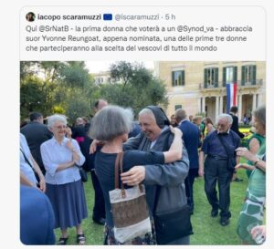 www.twitter.com/MirtiMedeiros Encontro de milhões (como diz aí no Brasil). A primeira mulher com direito de voto num sínodo da Igreja Católica abraçando a outra que participará da escolha direta dos bispos, algo inédito na história da Cúria Romana.