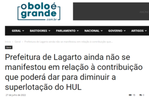 Lagarto: Prefeitura ainda não se manifestou em relação à contribuição que poderá dar para diminuir a superlotação do HUL II Finaliza a matéria do site: “Como se não bastasse, há denúncias constantes da falta de atendimento e até insumos básicos, como por exemplo, gases para curativo no Posto de Saúde do povoado Colônia 13, como denunciado no Programa Sergipe em Destaque, da quarta-feira, 27. Para piorar, o silêncio da Prefeitura de Lagarto, que até o momento não se pronunciou como poderá contribuir para melhorias e ampliação dos atendimentos de casos leves, para que não precisem superlotar o Hospital Universitário de Lagarto.”