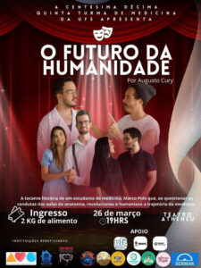 Amanhã, 26, peça “O Futuro da Humanidade” Amanhã, 26, o Curso de Medicina da Universidade Federal de Sergipe (UFS) apresentará a peça “O futuro da humanidade”, organizada pelo professor Dr. José Aderval Aragão, no Teatro Atheneu, às 19h. A peça, em sua 12ª edição, promete emocionar e inspirar o público, ao mesmo tempo em que beneficia instituições de caridade como AMO, AAACASE e AVOSOS.