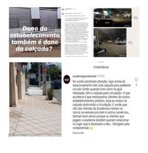 Confissão de culpa Não tendo o que justiçar o dono fez uma postagem para responder a matéria no Instagram “Melhor do Jabotiana” que foi uma confissão de culpa onde assume que rebaixou a calçada e que colocou os cones e correntes para privilegiar os clientes da academia dele. A repercussão negativa nos comentário foi enorme e ele simplesmente apagou o comentário. Ou seja, assumiu o outro erro novamente. Veja o print também acima.