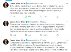 Muitas vezes, um assunto delicado como o atual, envolvendo o insano presidente e a negação das urnas eletrônicas, é definido em poucas palavras. Do sergipano, Carlos Carlos Ayres Britto, ministro aposentado do STF pelo twitter: